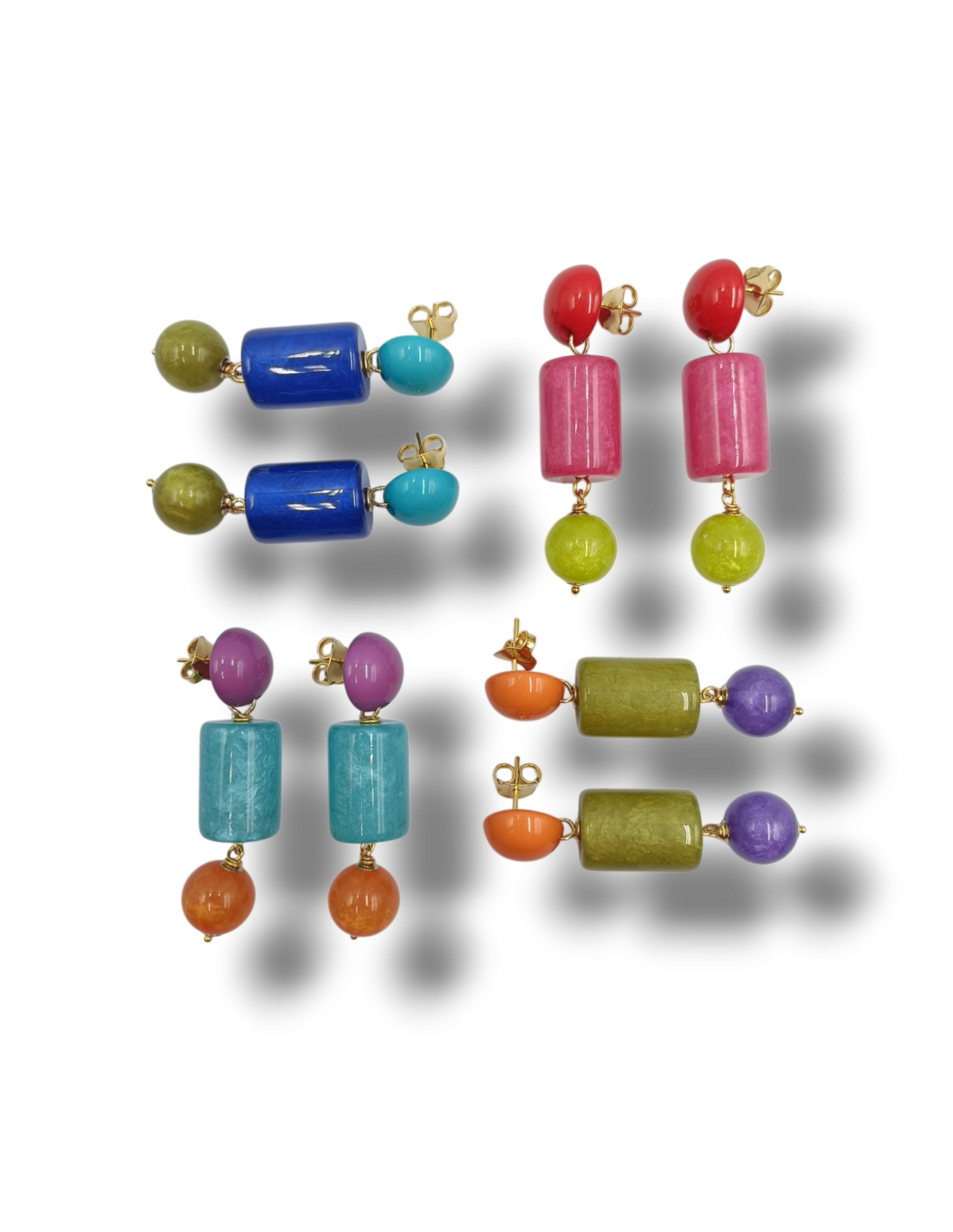 Add a splash of color to your look with these eye-catching dangling earrings, handcrafted from premium Italian resin. Featuring a pastel semi-spherical stud and vibrant speckled beads in cylindrical and spherical shapes, each piece boasts a glossy, translucent finish that makes the colors truly pop.