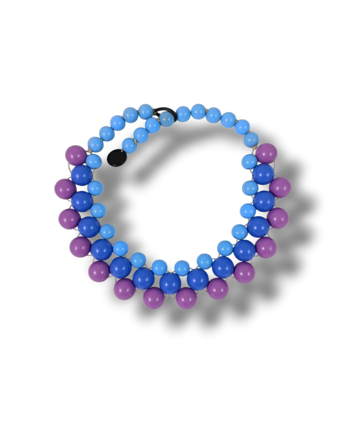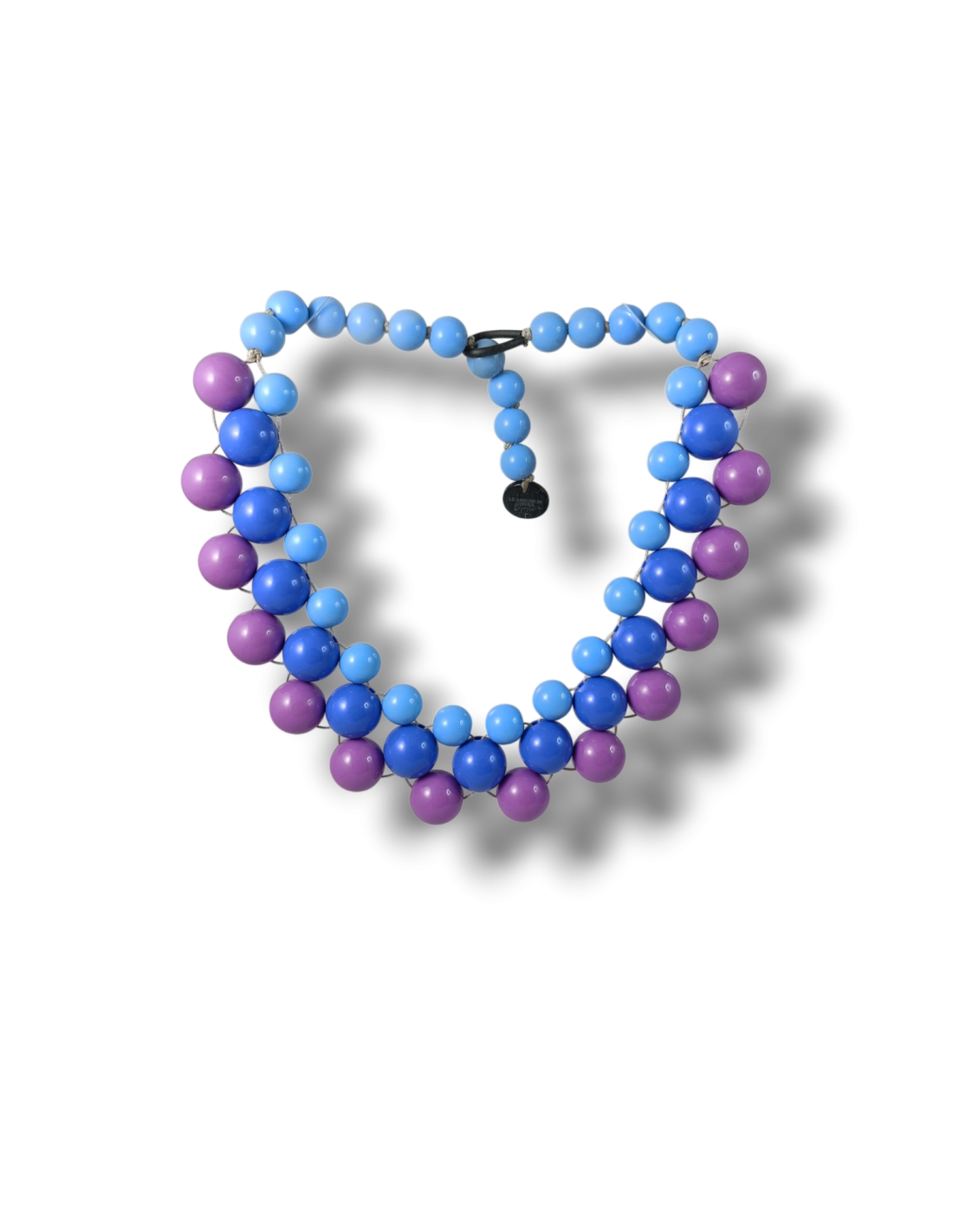 Collana girocollo realizzata a mano con sfere in resina italiana di alta qualità. Completamente anallergica poiché non contiene metallo in nessuna sua parte. La chiusura consiste in un’asola di pvc che si fissa direttamente alle sfere della collana, in questo modo partendo dall’ultima sfera (e mai dalla medaglietta logo posta sull’estremità!) a proseguire, è possibile regolarne la lunghezza.