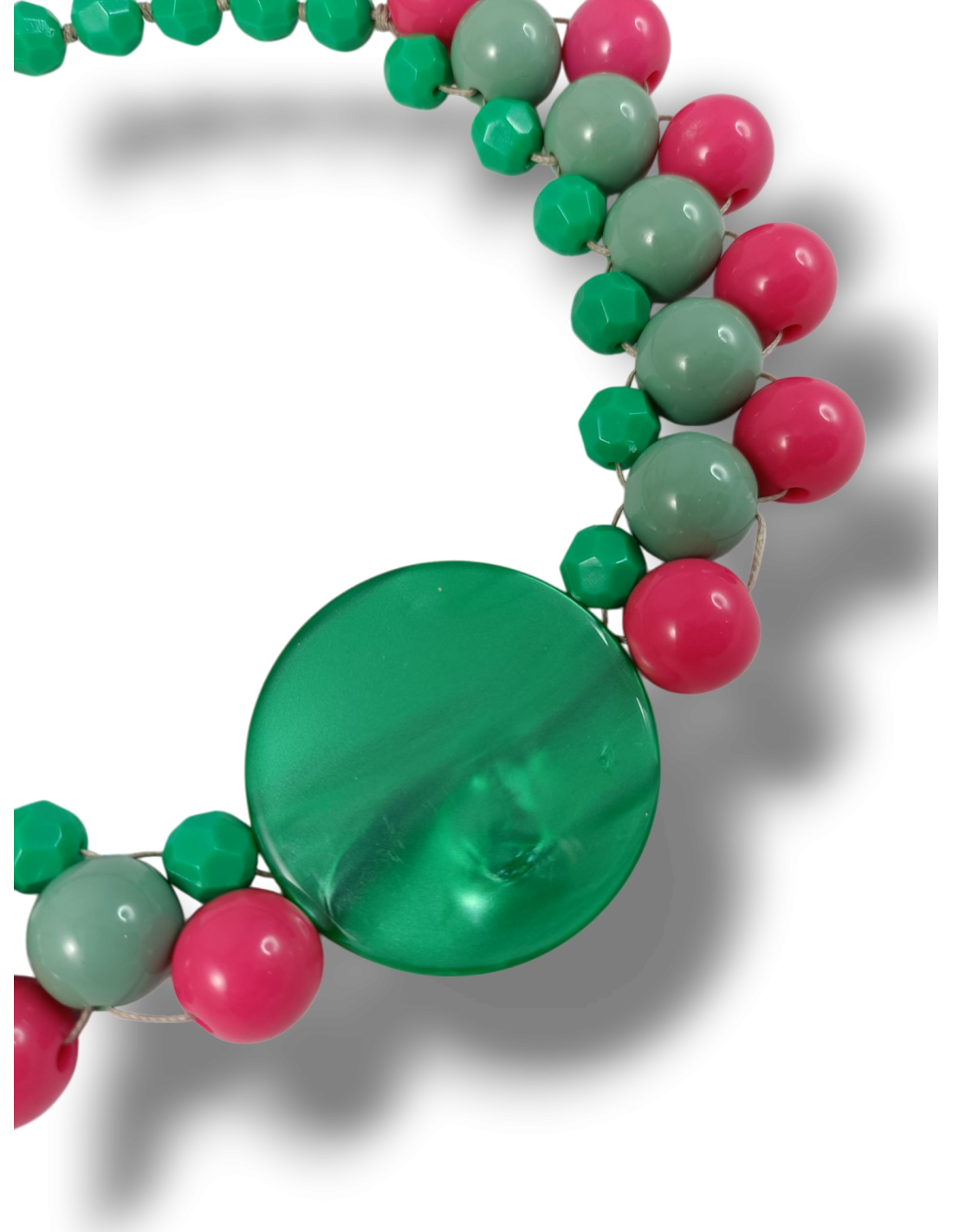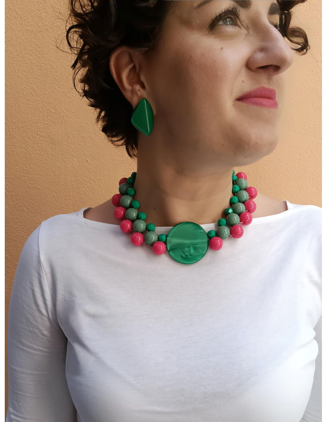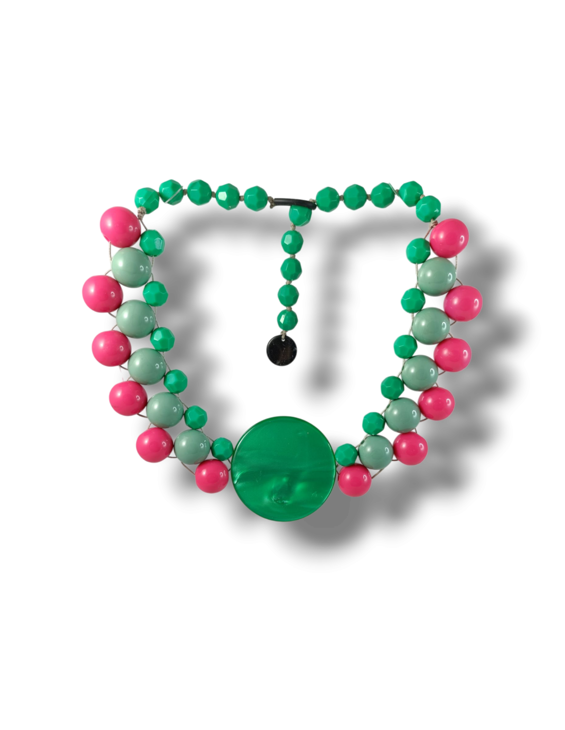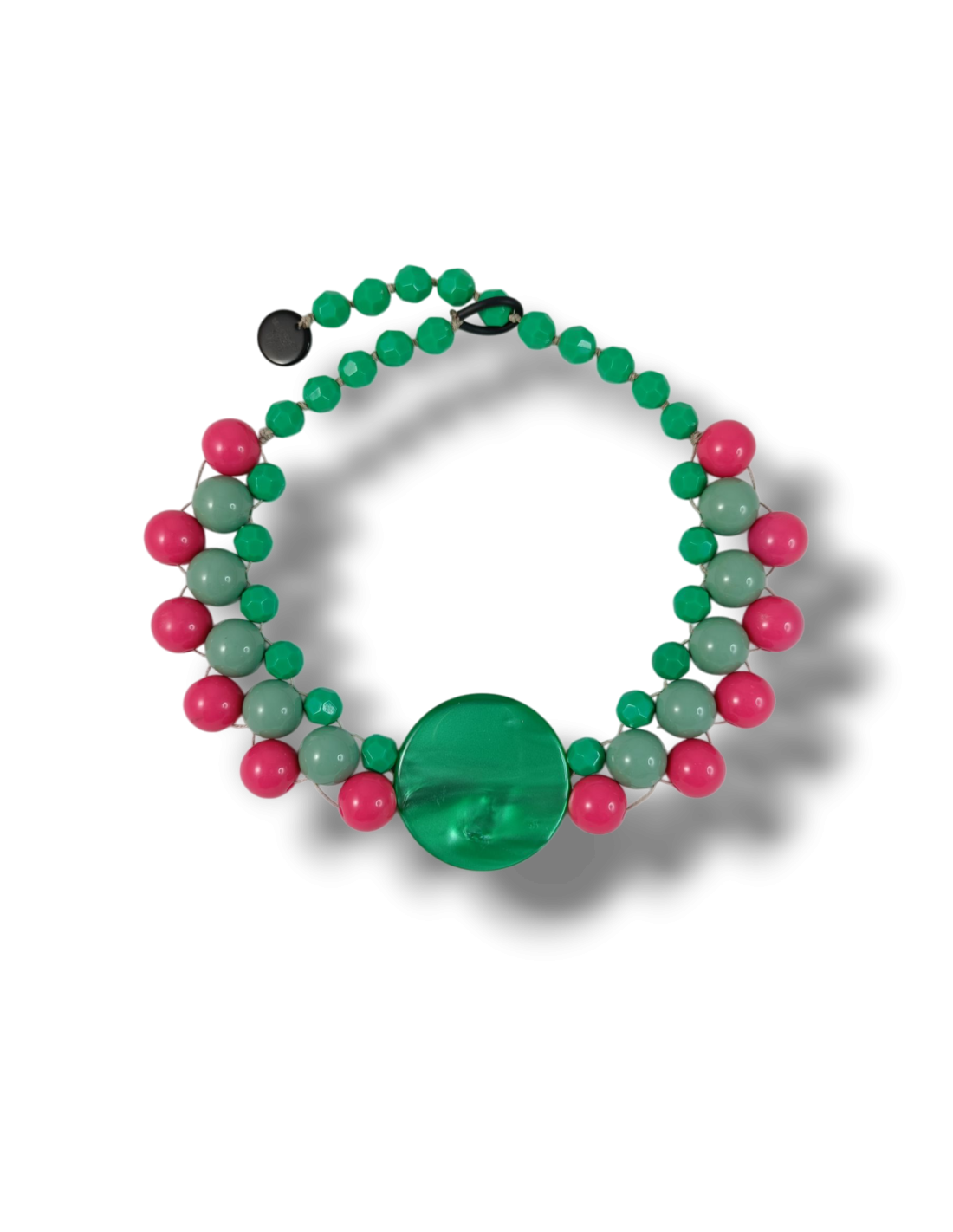 Collana girocollo realizzata a mano con elementi in resina italiana di alta qualità. Un bellissimo tondo dall’ effetto madreperla spezza e impreziosisce con la sua morbida luce la sequenza di sfere colorate intrecciate.