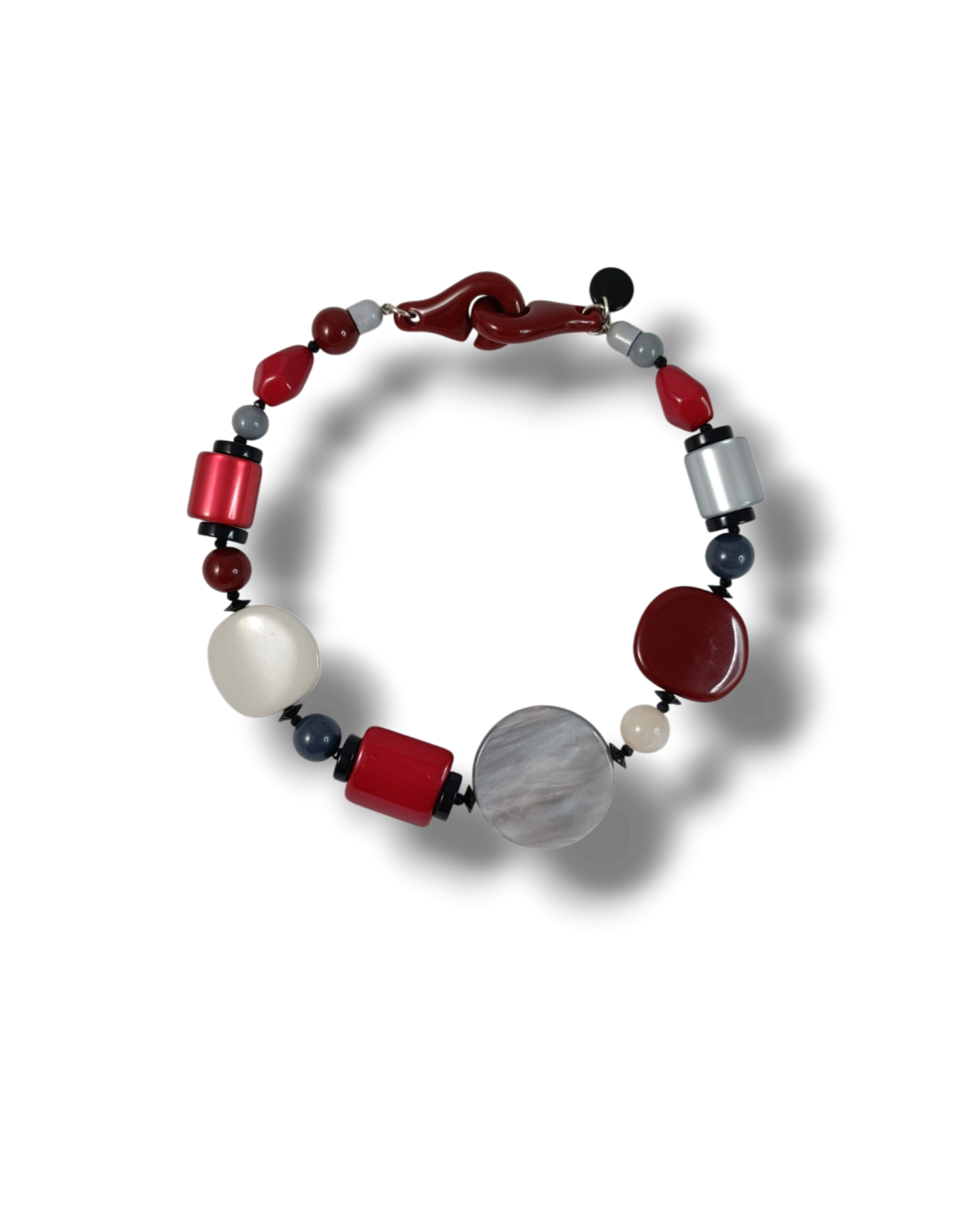 La chiusura è composta da un doppio gancio in tinta unita di colore pastello, in armonia con il cromatismo della collana. I componenti metallici sono anallergici, in ottone galvanizzato, gli elementi in resina sono di alta qualità, tutti prodotti in Italia. Colori: bordeaux, grigio e nero.
