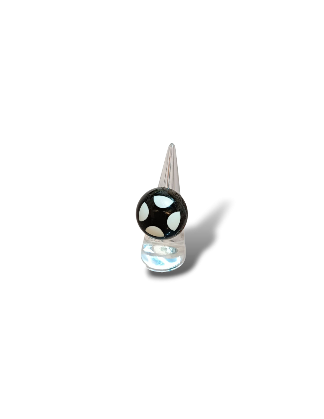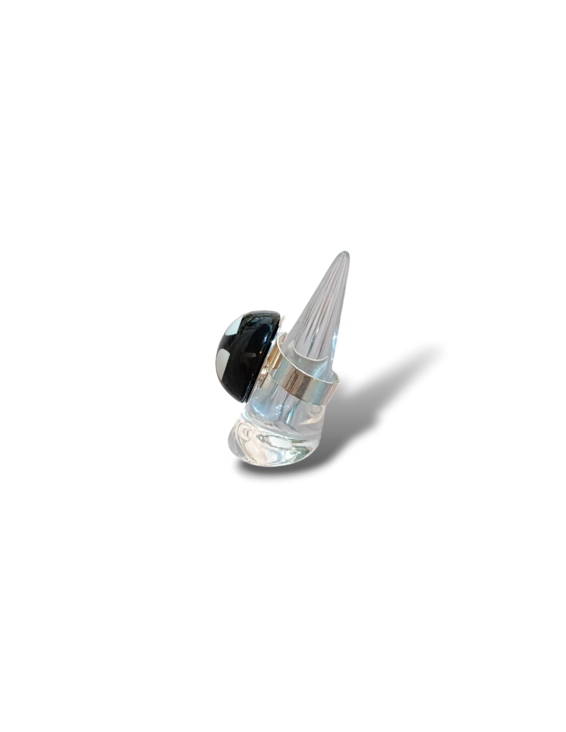 Anello dal design essenziale e contemporaneo, con elemento frontale a semisfera decorato da un motivo a pois bianco ottico e nero, per un contrasto grafico elegante e senza tempo.