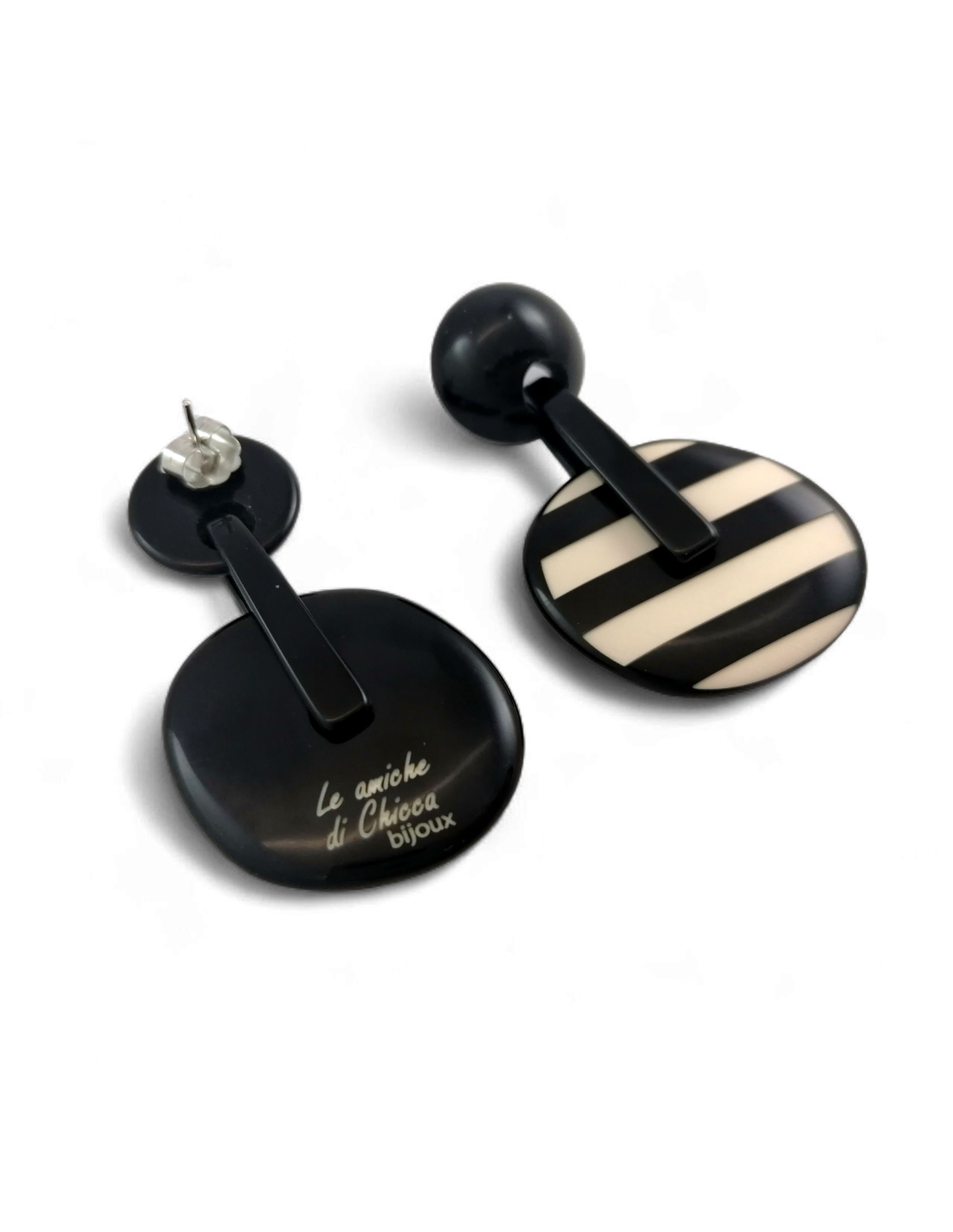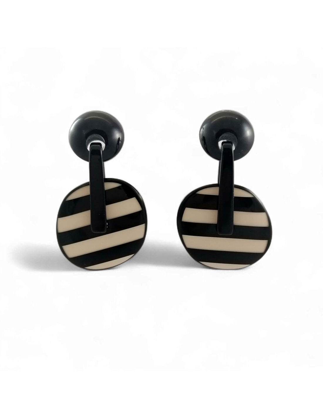 Orecchini dal design moderno e minimale, pensati per chi ama distinguersi con stile. Il lobo è impreziosito da un cabochon nero lucido, da cui scende una barretta nera abbinata a un centrale bicolore a righe avorio e nero, per un elegante effetto grafico.