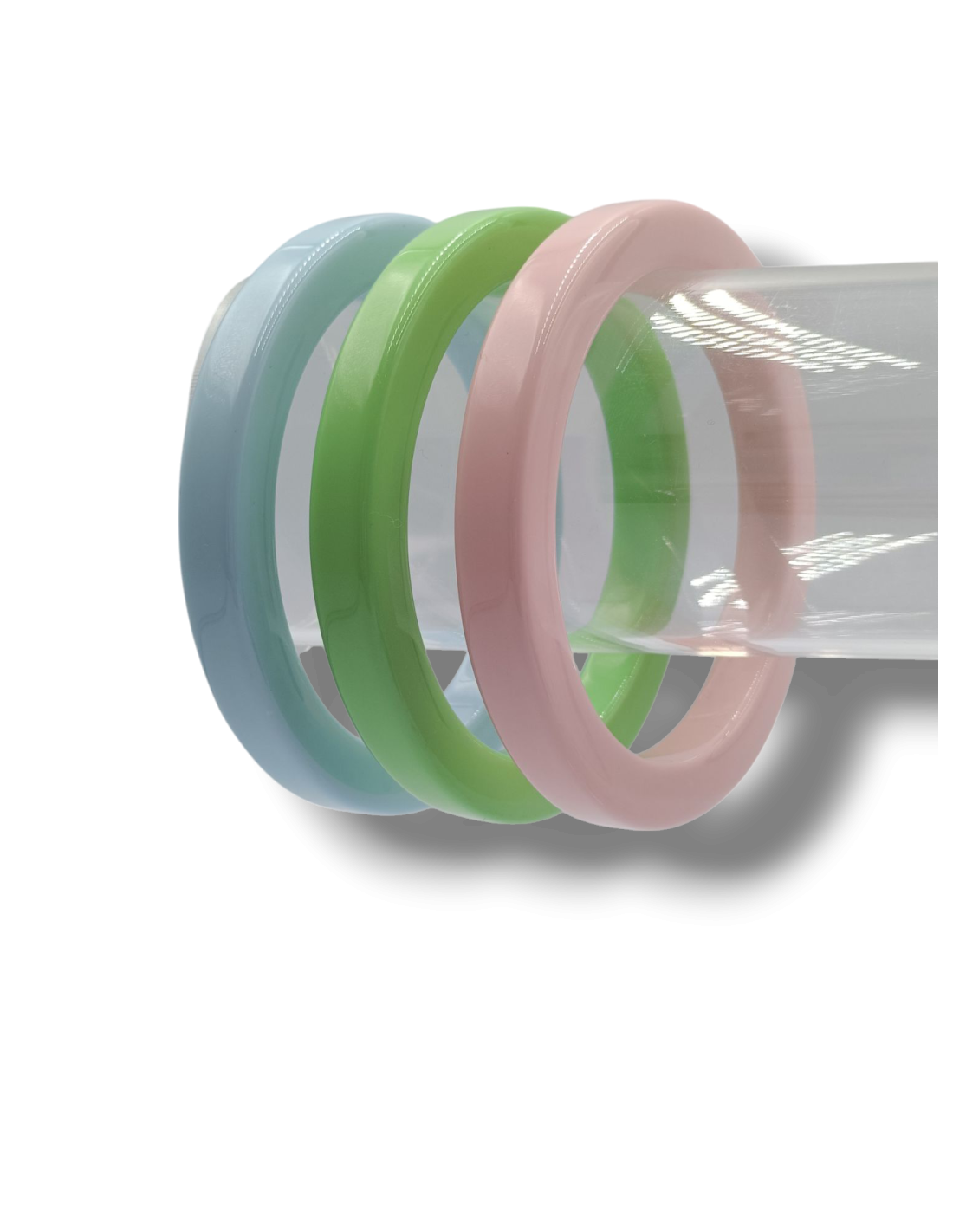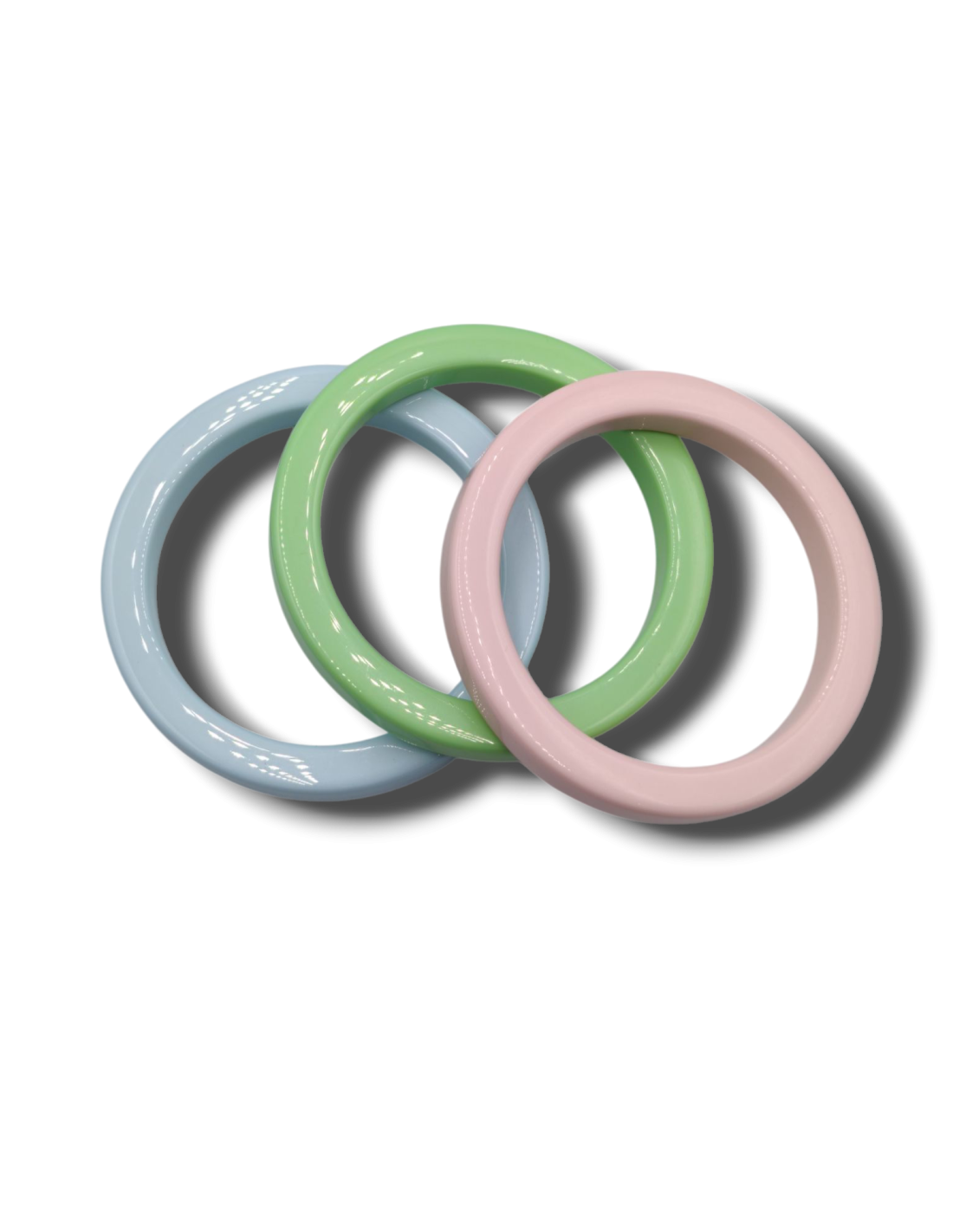 Tondo e leggero dalla forma appena smussata, declinato in una miriade di colori ed effetti. Bellissimo indossato da solo, ma ancora meglio se in coppia o in gruppi di 3 o 5 bracciali, per creare giochi di colore col proprio outfit! Colore pieno, tinta pastello.