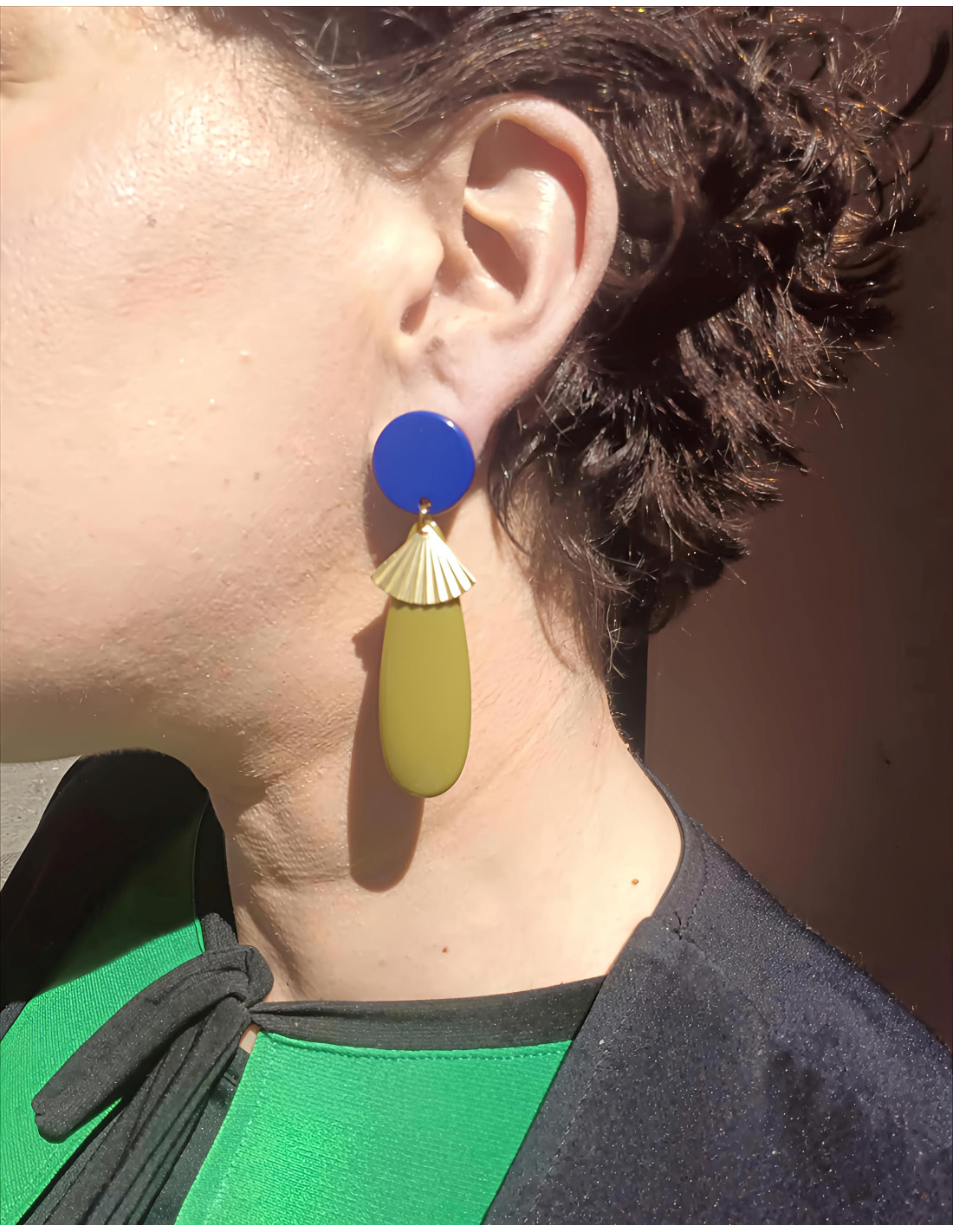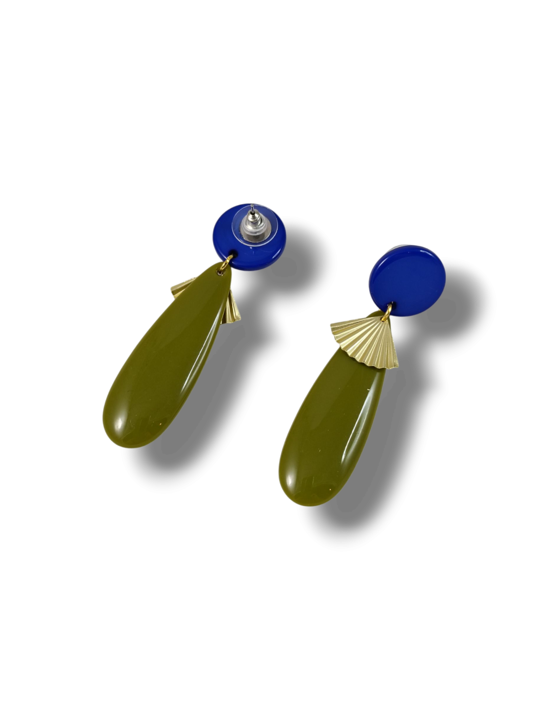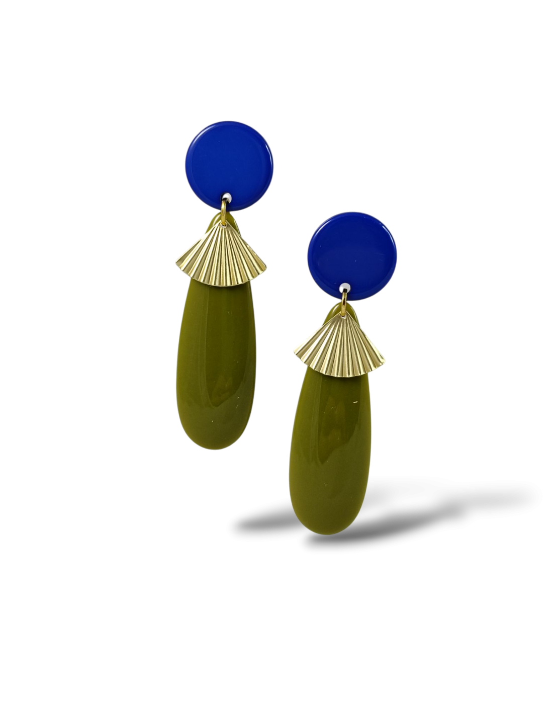 Orecchini pendenti dalla forma allungata, rivisitazione di un classico modello della gioielleria in chiave pop! Gocce piatte full color, abbinate a tondi che fissano l’orecchino al lobo in tinta unita e infine delicati piccoli ventagli plissettati color oro, che illuminano il viso grazie al loro movimento delicato e tintinnante. Componenti in resina italiana di alta qualità, mentre gli elementi in metallo sono anallergici in ottone galvanizzato.