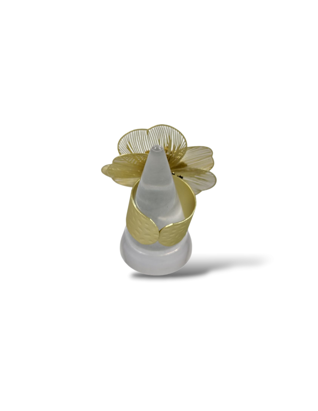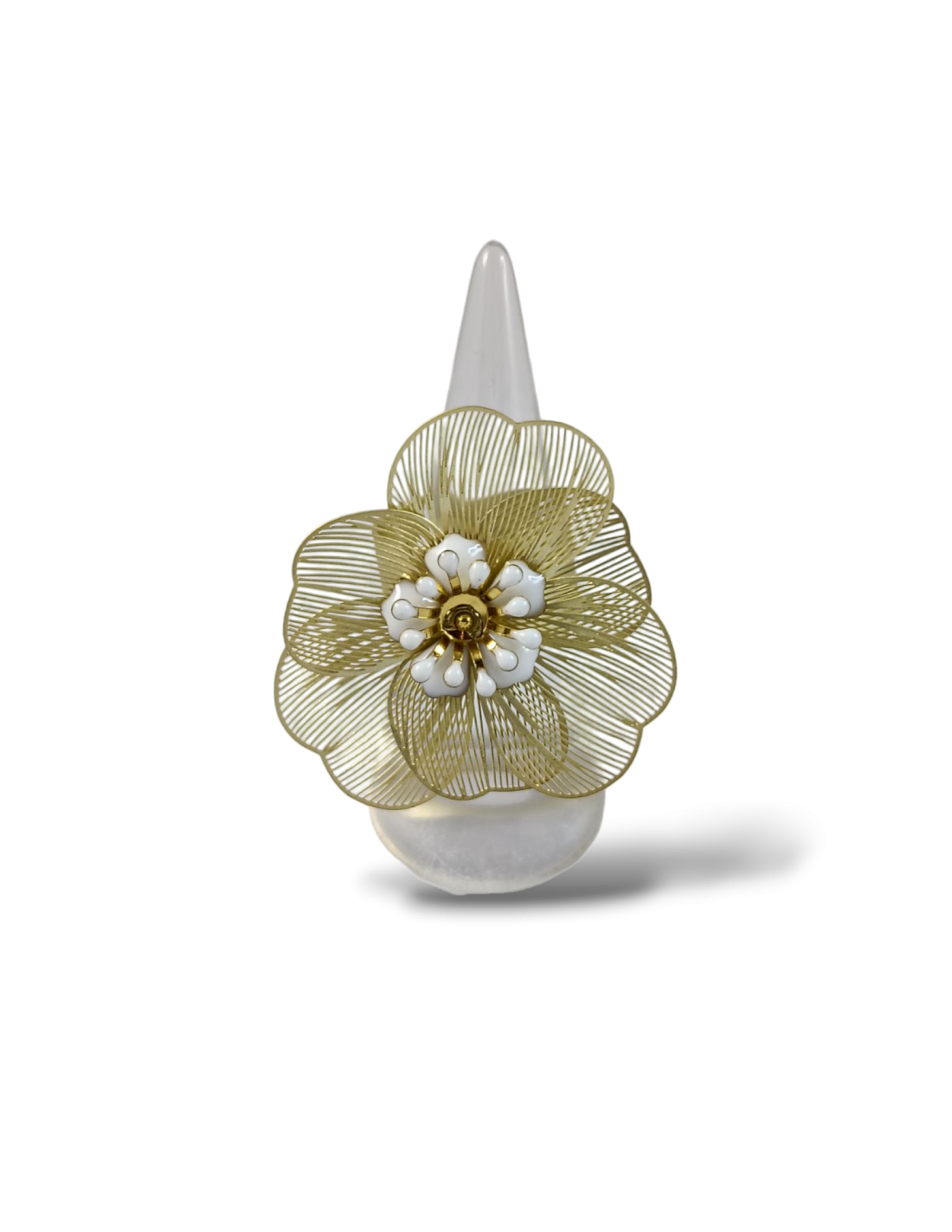 Anello composto da una base a fascia in ottone galvanizzato effetto martellato e da un fiore in filigrana di ottone e smalto. Un anello davvero romantico!