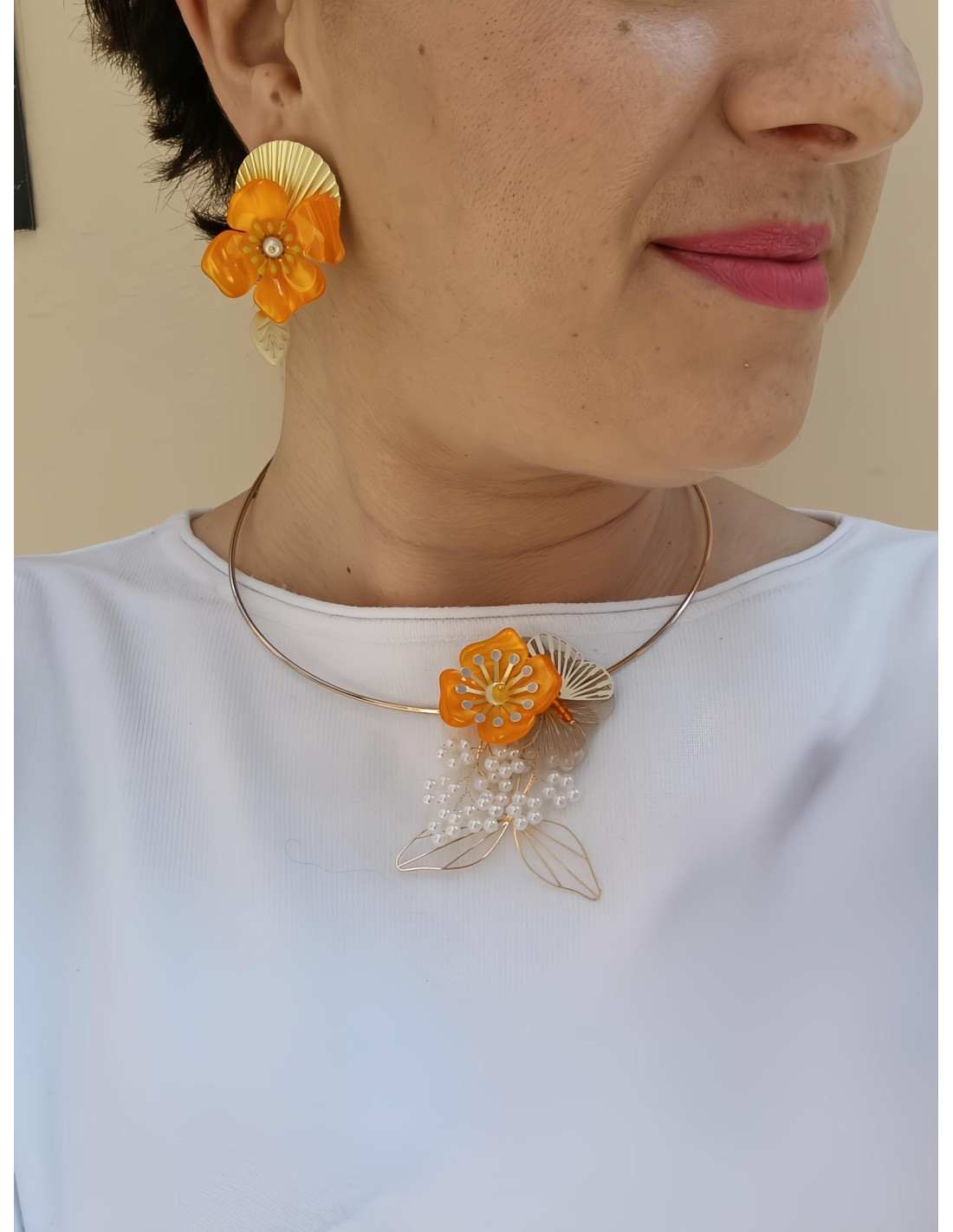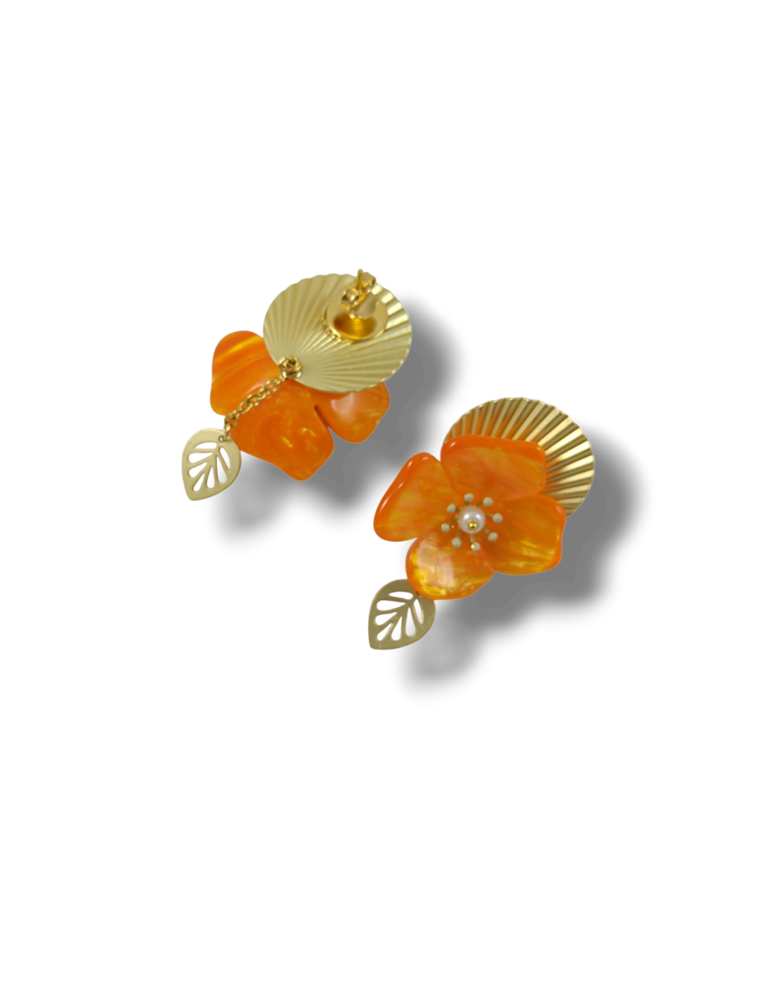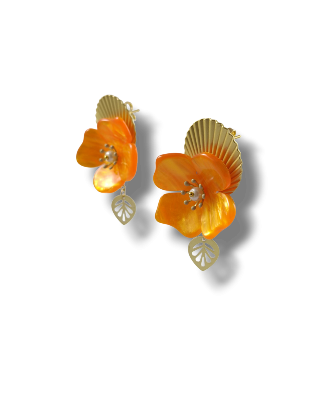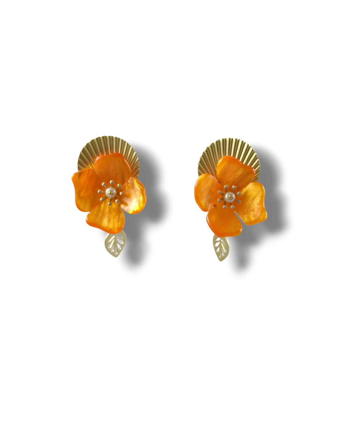 Orecchini pendenti realizzati a mano, composti da tondi a lobo lavorati a plissé e da fiori in resina effetto madreperla di altissima qualità. Concludono gli orecchini due piccole foglie dorate. Tutti gli elementi metallici sono anallergici in ottone galvanizzato oro opaco.