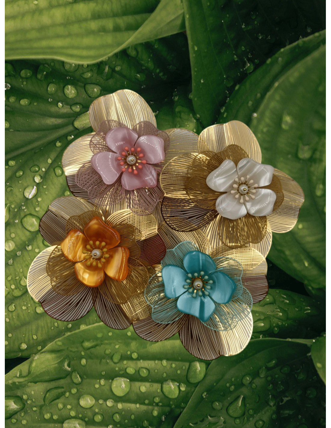 Fiore composto da petali sovrapposti, partendo da quelli più esterni in filigrana di ottone fino all’elemento centrale, composto da un fiore a quattro petali in resina effetto madreperla. Molto luminosa e leggera, questa spilla è perfetta per decorare non solo le giacche, ma per personalizzare t-shirt e golfini.