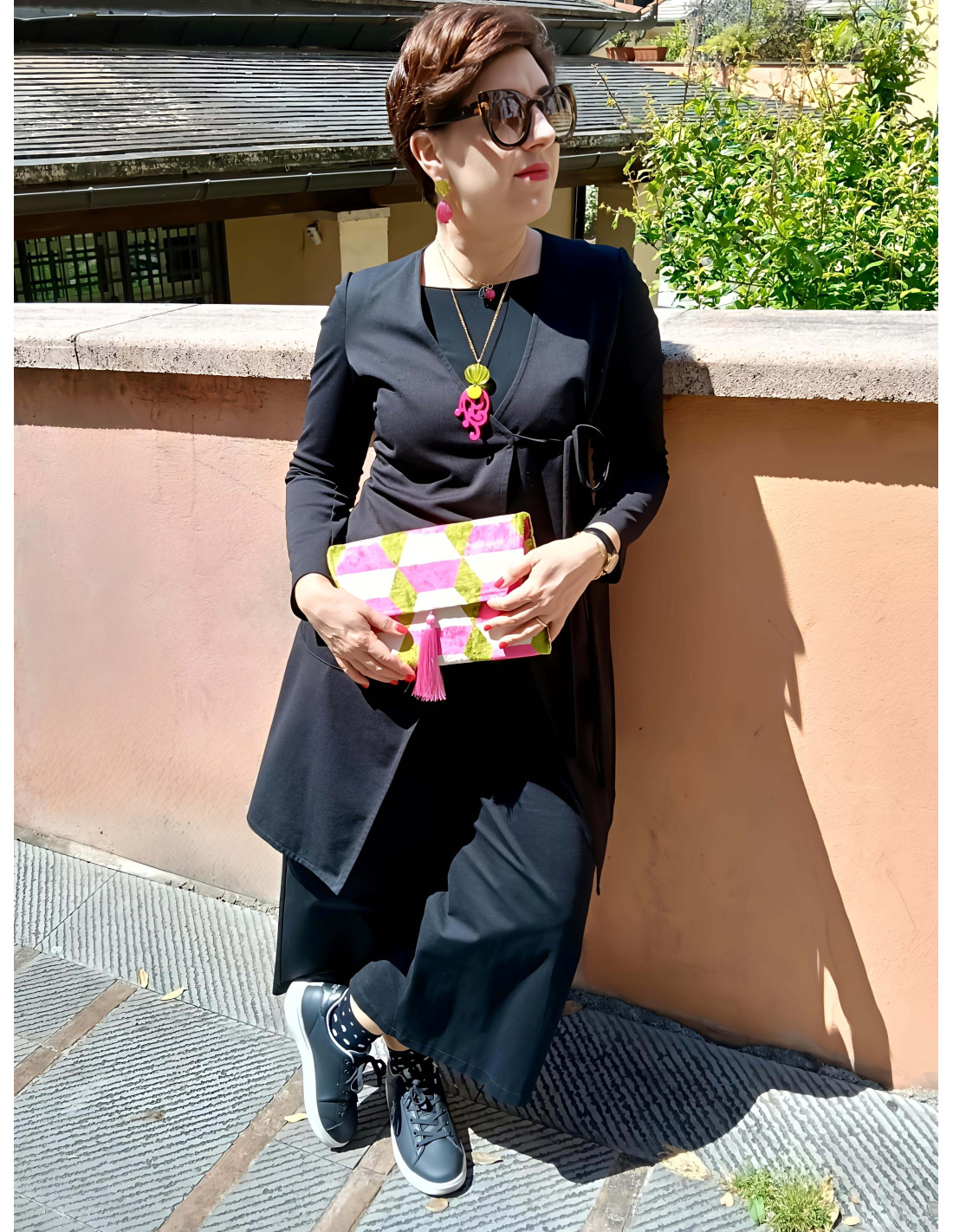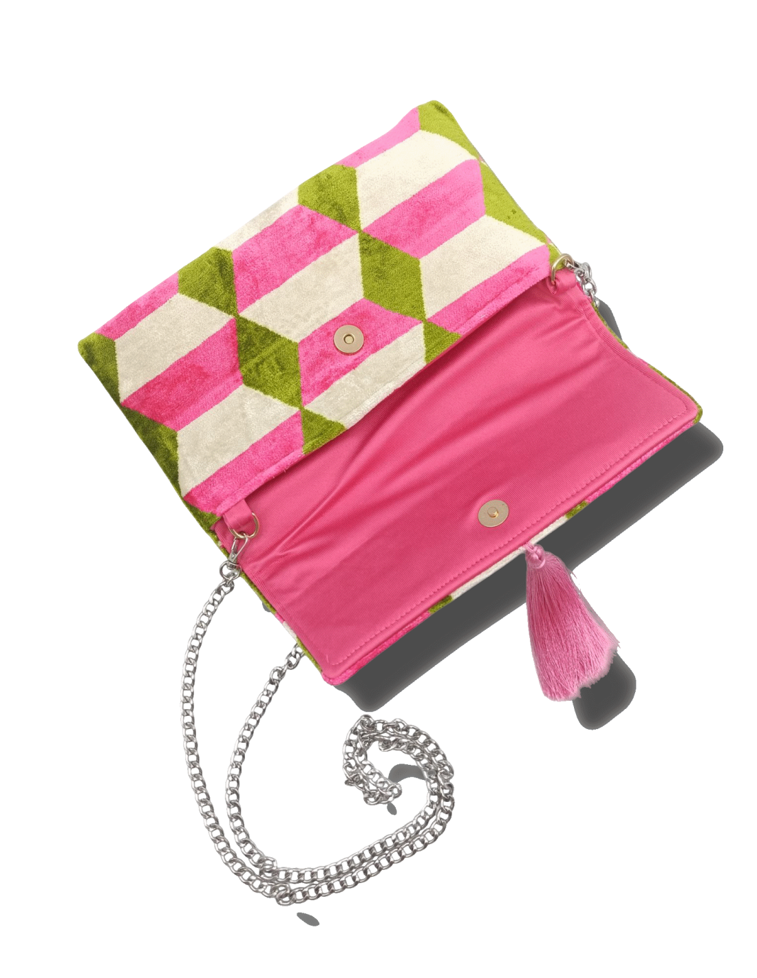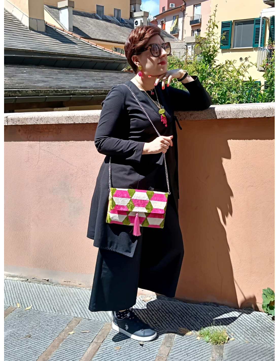 Si può utilizzare come una clutch a mano oppure indossarla a spalla. Il tessuto, nato per scopi di arredo, la rende una borsa tanto bella e decorativa, quanto pratica e resistente! Un’esplosione di colore e motivi geometrici!