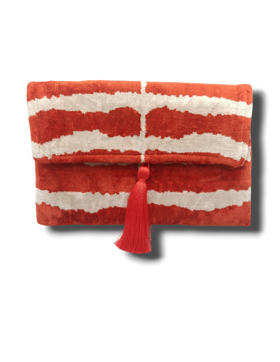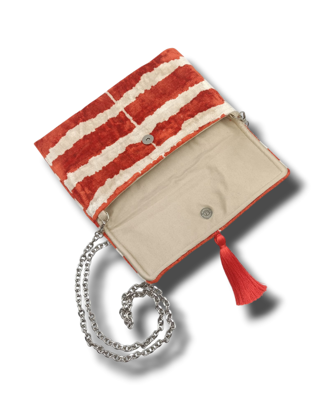 Si può utilizzare come una clutch a mano oppure indossarla a spalla. Il tessuto, nato per scopi di arredo, la rende una borsa tanto bella e decorativa, quanto pratica e resistente. Un’esplosione di colore e motivi geometrici!