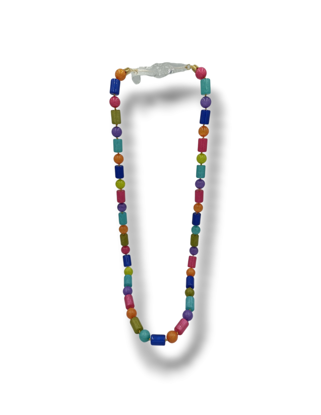 Collana lunga realizzata a mano con elementi cilindrici e sferici in resina italiana di alta qualità dai colori incredibilmente brillanti, con effetto screziato. Si può indossare anche girandola due volte intorno al collo. La chiusura a doppio gancio in resina cristallo trasparente, molto decorativa, fa sì che si possa indossare anche a vista. Gli elementi in metallo sono in ottone anallergico galvanizzato oro.