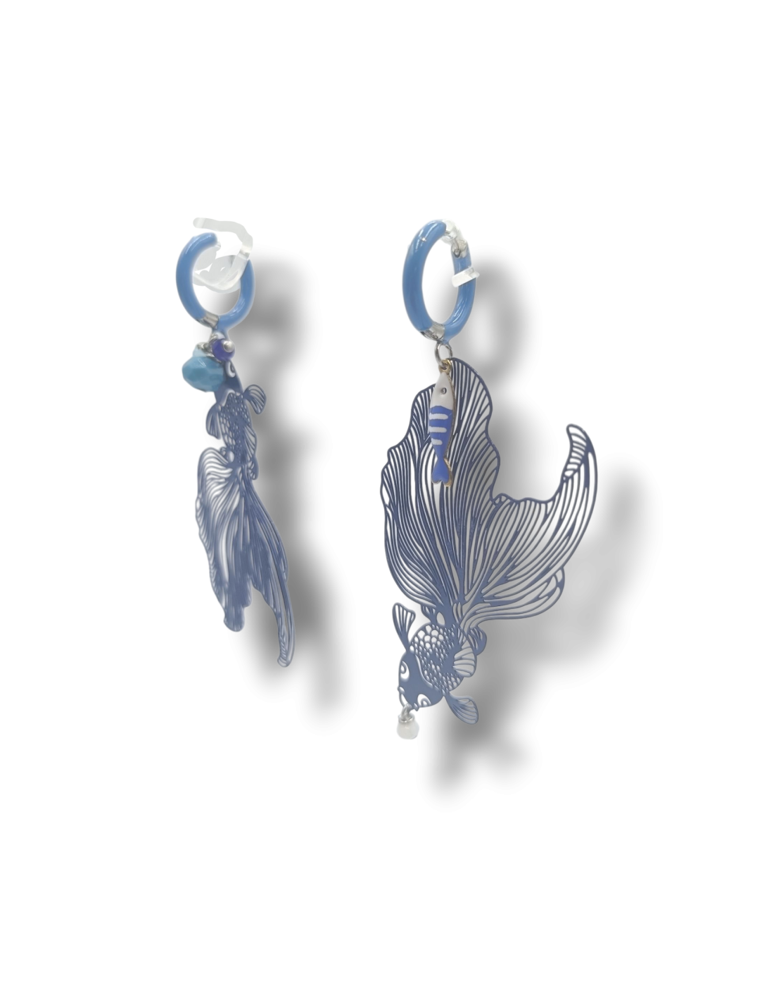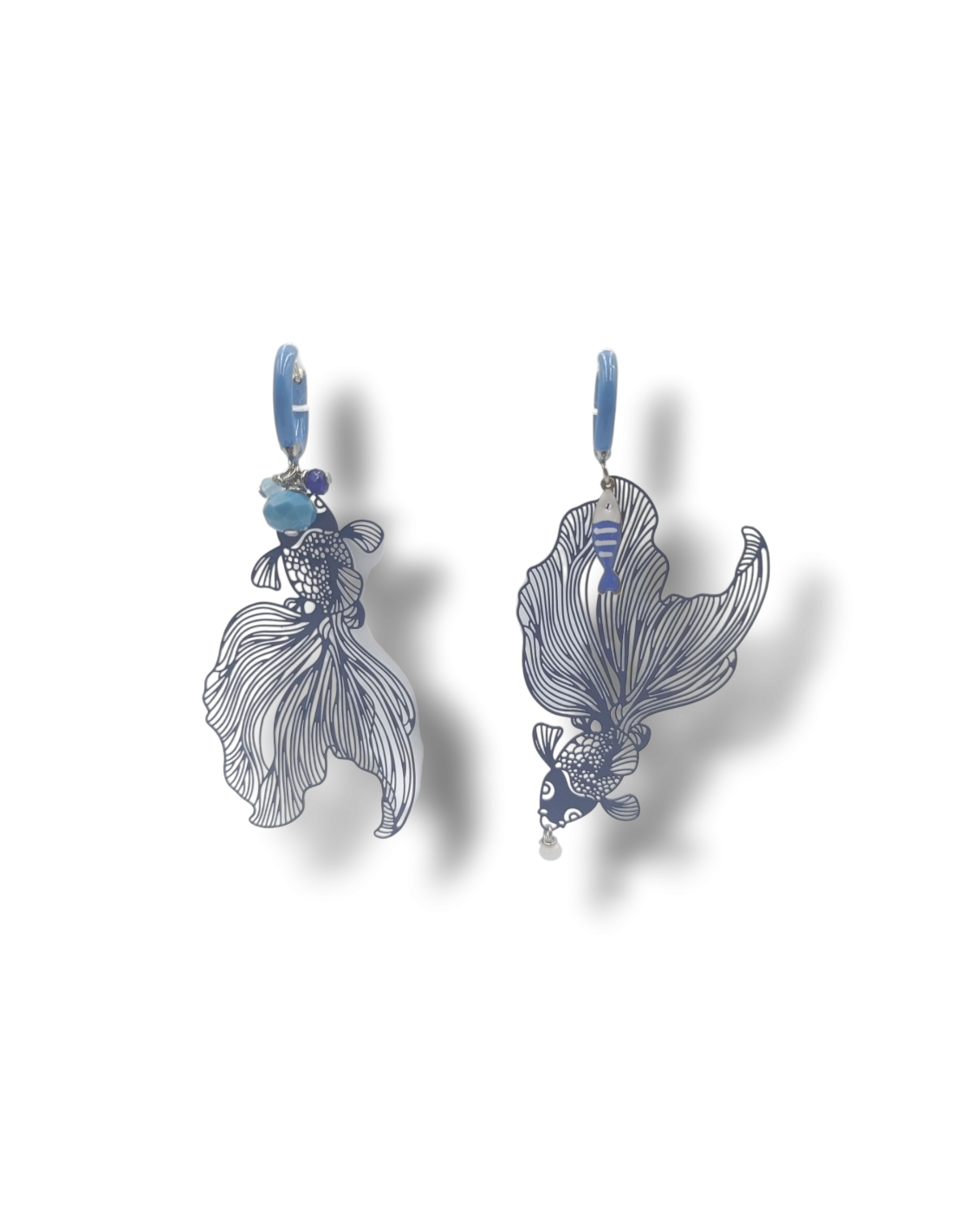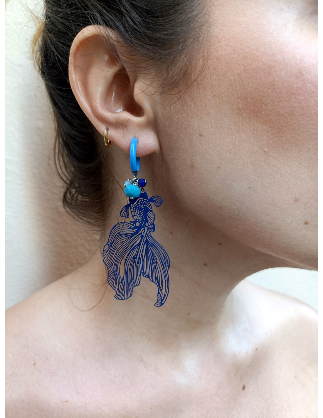 Questi orecchini leggeri e sinuosi ne portano l’essenza: filigrana in ottone colorato, charms smaltati in acciaio e piccoli mezzicristalli che catturano la luce.