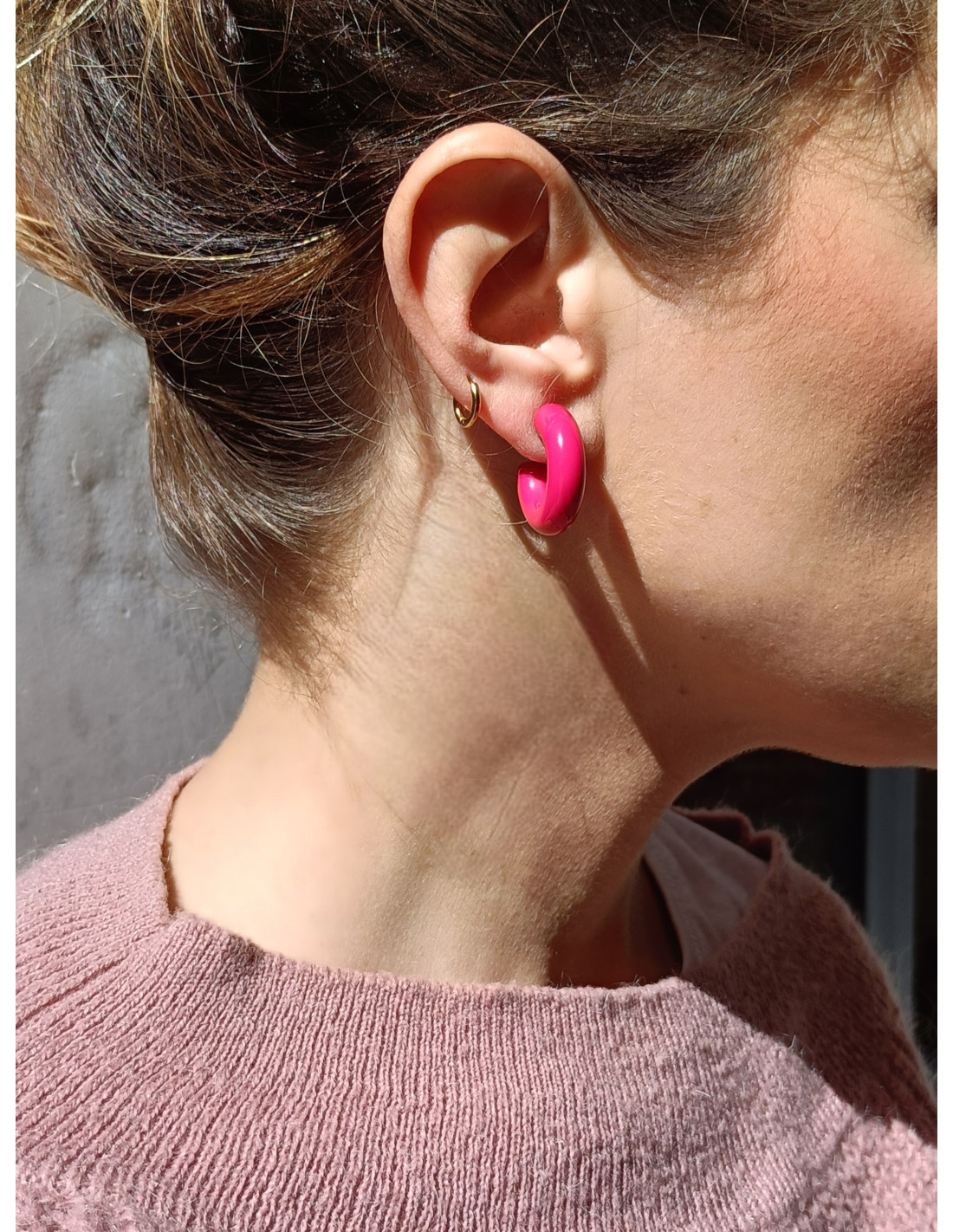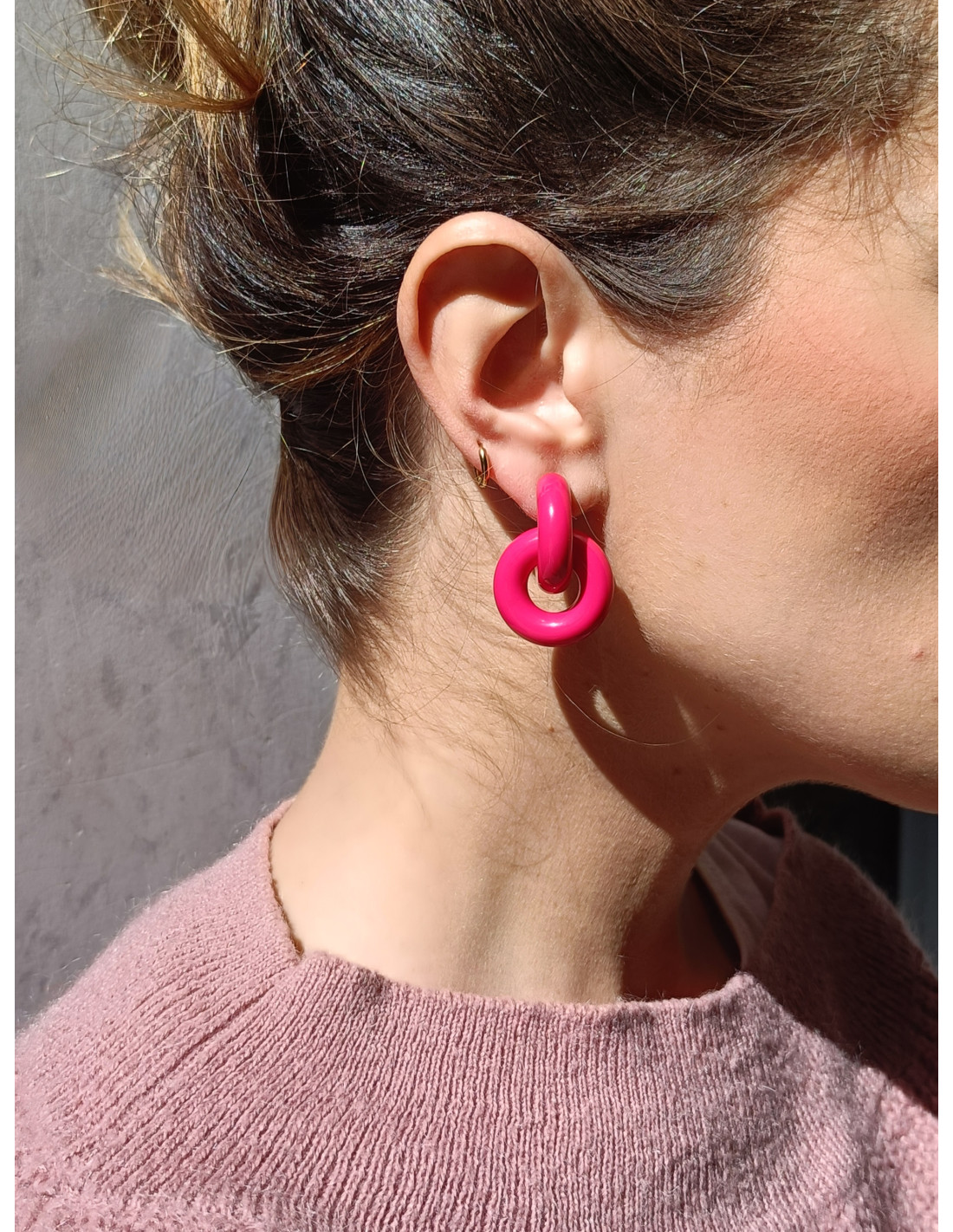 Gli orecchini Hula Hoop sono realizzati in resina italiana di alta qualità e composti da un semicerchio che abbraccia il lobo e un cerchio pendente che lo attraversa, creando un gioco di forme essenziale ma d’effetto.
